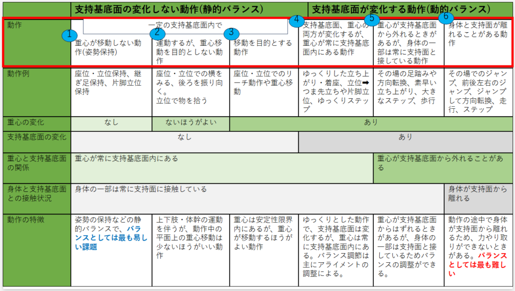 重心と支持基底面の関係から動作を6つに細分できる。​
